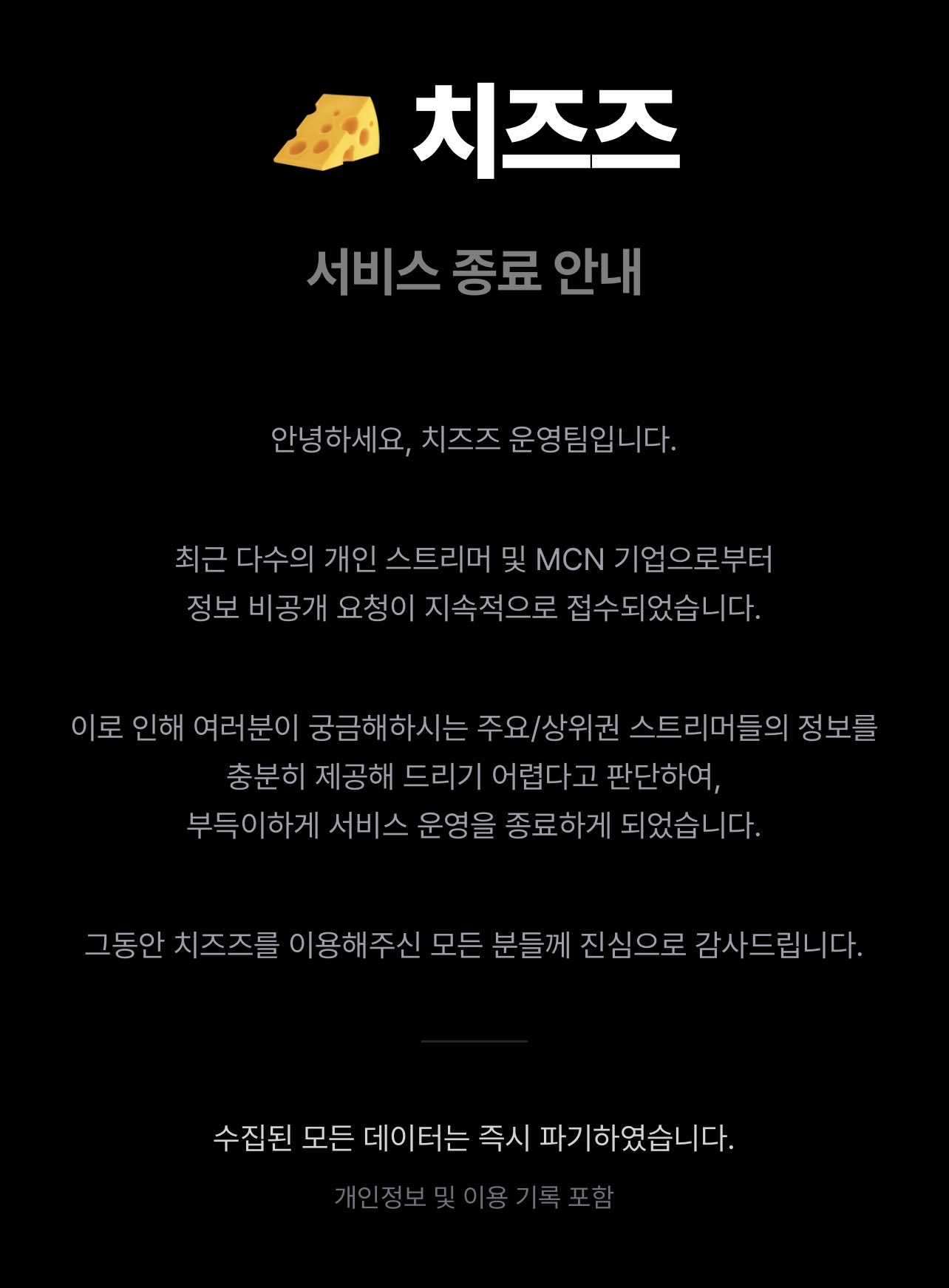 최근 유명 스트리머부터 중소 규모 스트리머의 후원 수익을 무단으로 집계해 공개한 웹사이트 '치즈즈'가 등장해 인터넷 방송계에 큰 파장을 일으켰다. 해당 사이트는 과도한 관심과 스트리머들의 거센 반발 속에 서비스를 조기 종료했다.