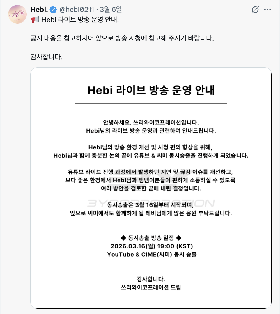 지난 6일, 헤비의 소속사 쓰리와이코프레이션은 공지사항을 통해 오는 3월 16일(월) 오후 7시부터 유튜브와 씨미(CIME) 플랫폼에서 동시 송출을 진행한다고 밝혔습니다.